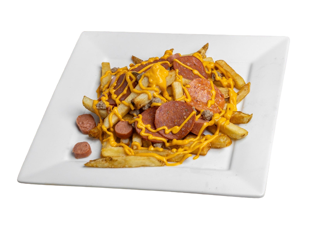 (A hearty pile of crispy fries topped with hotdogs, pepperoni, cheese, onions, and beef chunks.)